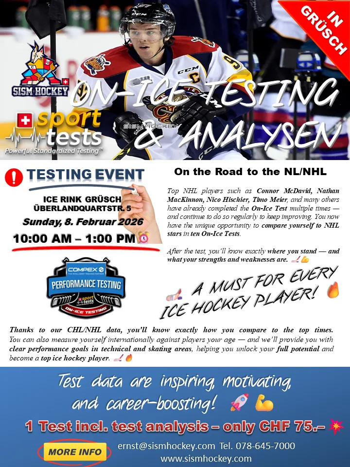 Top picks like Nathan MacKinnon (2013), Aaron Eckblad (2014), Connor McDavid (2015) and Nico Hischier (2017) and other Swiss NHL cracks like Timo Meier, Mirco Müller, Philipp Kurashev etc. have completed the test. Since 2015, Sport-Tests (Switzerland) has been offering these tests, which are carried out by SISM Hockey. The on-ice test has already gained a foothold in Europe and Central Asia. So far, almost 3,000 players between the ages of 7 and 40 have been tested on-ice. In addition to renowned Swiss ice hockey clubs such as HC Davos, Fribourg-Gottéron, Rapperswil Lakers, EV Zug, EHC Kloten, SC Langenthal, EHC Visp and HC Thurgau, SISM Hockey has also tested foreign teams several times.